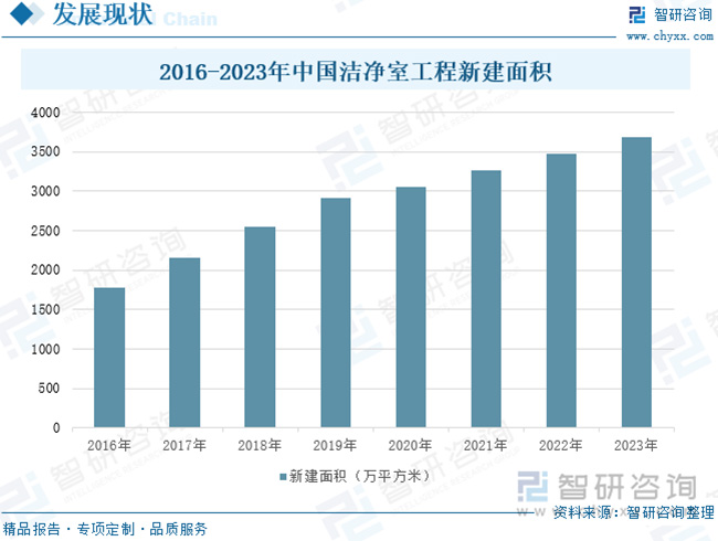 目前,全球半導體、光電等電子信息產業在世界范圍內轉移,東亞、東南亞等地區已成為世界電子信息行業的主要市場和發展重心;同時由于我國醫藥衛生、半導體、航空航天等事業的不斷發展,加速推動了潔凈室的市場化需求,從而帶動我國潔凈室工程產業的快速發展。2023年,中國潔凈室工程新建面積達3689萬平方米,同比增長6.04%。