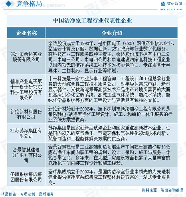 超潔凈環境控制又融合了風險評估、生產認證的概念和程序,加之潔凈技術跨行業、跨專業、跨學科的特點,使得潔凈室工程的難度和復雜性增加。因此對于潔凈室工程行業來說,優化設計、現場施工環境的協調與管控、工程相關技術細節的經驗積累,對客戶需求的理解和實現,以及對設計變更的準備和響應程度等都是衡量潔凈室工程企業競爭能力的重要指標。?目前,我國潔凈室工程行業競爭較為激烈,企業數量較多。其中,桑達股份、十一科技、蘇凈集團、新綸新材、柏誠股份、亞翔集成等設計研究院或建設承包企業在降低建造成本、提高潔凈室的穩定性等方面占據優勢,能提供高端潔凈室系統集成解決方案,位居行業領先地位。同時,行業內還存在大量規模較小、技術水平與綜合解決方案能力有限的潔凈室工程企業,普遍集中在對潔凈等級要求不高的低端市場。