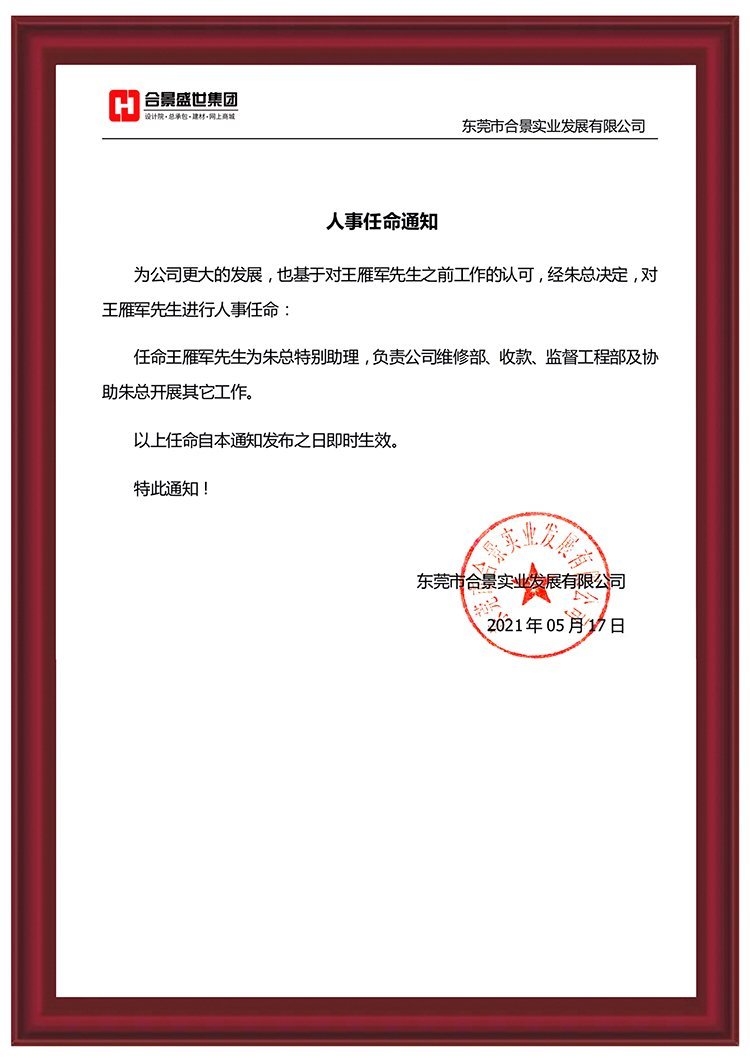 為推動公司更大發展,經公司綜合評估,王雁軍先生將擔任朱總特別助理,負責公司維修部、收款、監理部及協助總經理開展其他工作。