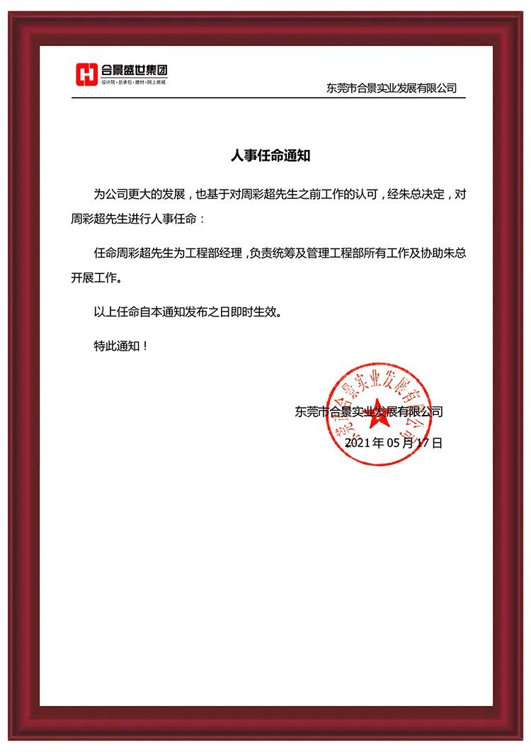 任命周彩超先生為工程部經理,負責統籌及管理工程部所有工作及協助總經理開展其他工作。