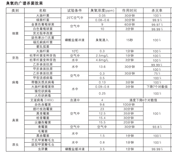 臭氧具有極強的氧化性的特點,被世界公認是一種廣譜高效殺菌劑,它的氧化能力高于氯一倍,滅菌比氯快600-3000倍,甚至幾秒鐘內可以殺死細菌,對于常見的大腸桿菌、糞鏈球菌、綠膿桿菌、金黃葡萄球菌、霉菌等,在臭氧的環境中5分鐘,其殺滅率可達到99%以上。