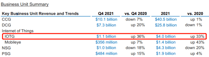 在晶圓代工巨頭臺積電公布的財報中,2021年其手機業務營收首次被HPC(大型高性能計算)業務超越,面向汽車板塊的營收和訂單需求也猛增。 圖像傳感器芯片設計龍頭韋爾股份最新財報顯示,其半導體業務收入同比增長18%,雖然智能手機CMOS占據營收大頭,但業績增長主要來源于車載CIS與安防CIS,尤其在安防領域實現高達60%的業績增長。 2021年物聯網事業部(IoTG)成為國際半導體巨頭英特爾增長最快的業務,同比增長33%,同時汽車自動駕駛業務也增速驚人,反觀主營PC終端的CCG部門業績僅增1個百分點。
